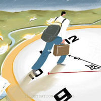 我终于明白了挂钟的时间,或者手表里的时间,只是时间的一个表象而已,它存在于更丰富的日常生活中——在涨了又枯的河流中,在小孩子戏耍的生活中,在花开花落中,在候鸟的一次次迁徙中,在我们岁岁不同的脸庞中,在桌子椅子不断增添新的划痕中,在一个人的声音由清脆而变得沙哑的过程中,在一场接着一场去了又来的寒冷和飞雪中。即使我们停下脚步,时间也会在行走。我们和时间是一对伴侣,相互依偎着,不朽的它会在我们不知不觉间引领我们一起走到天荒地老去。