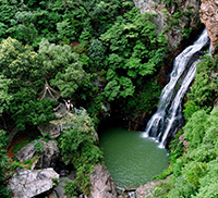 沿着山路继续往上,过来小桥,就来到了龙须潭。龙须潭与雷响潭完全不同的风格。龙须潭是十二三岁的窈窕淑女,而雷响潭却是身材魁梧的中年男子。水沿着石壁缓缓的、慢慢的、一点一点的向下流着。这个瀑布有着许多分支,分支都很细,多像传说中那神龙的胡须呀!