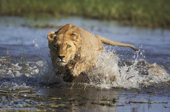 拍摄地点:博茨瓦纳的奥卡瓦戈三角洲 作者:布莱恩·汉普顿 位于博茨瓦纳的奥卡瓦戈三角洲是由于季节性洪水泛滥而形成的内陆陆地,也是当地生物群在旱季的一块永久性水源。由于这里独一无二的内嵌式结构和水路体系,在此生活着非洲南部最丰富的动物族群之一。狮子习惯于在潮湿的沼泽地活动,同时由于它们为潜近追踪猎物需要面对不同的多变环境,有时甚至会被迫游泳或蹚过河流。作者描述:“图中的这只狮子正试图和狮群一起追踪一群非洲野牛,途中需要跨越一条常有大批鳄鱼出没的危险河流。听到其它狮群的呼唤后,她开始朝河水的方向进发,途中我不得不几次调整位置,潜伏在她可以渡河的地方,幸运的是我的600mm专业镜头正好捕捉到了狮子突然启动、蹚过小河时的眼神。我和搭档一动不动地挤成一团,狮子就正朝我们奔来,然后擦肩而过,重新加入狮群,直到这时我们才长舒一口气放松下来。”