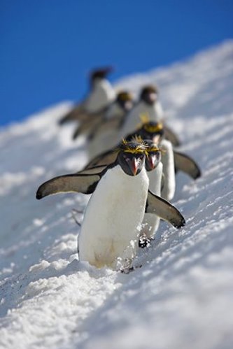拍摄地点:南乔治亚岛 作者:安德鲁·鲁斯 马卡罗尼企鹅是世界上企鹅数量最多的一种,也是六种冠企鹅中种群最大的一种。站着时高约28英寸,重10道15磅,它们长着红眼睛,红喙,冠上长着橙黄色的羽毛,很漂亮。马卡罗尼企鹅主要分布于南极半岛及亚南极区。你能在乔治亚州南部的悬崖和山坡上发现它们庞大的种群——约540万对。南大洋的这个多岩石岛为我们提供了一个观察野生动物和欣赏包括这里有数目众多的海鸟和沿海岸繁殖的海洋哺乳动物在内的未被破坏的美丽风景的绝好机会。安德鲁·鲁斯说:“在我登高爬山想要得到海湾的广角视野的时候,我看到企鹅排成一行正穿越一座冰川。看到此景,我不禁失声笑起来,我一定要拍下照片来记录这一风景。在花了30分钟用背滑下山后(谁说摄影没有乐趣?),我拿起相机,微笑着度过这个下午,因为一波又一波的马卡罗尼企鹅从我面前的冰川上经过。”