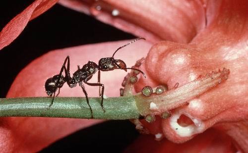 在哥斯达黎加一只猛蚁守着一个西番莲的外花蜜槽。
