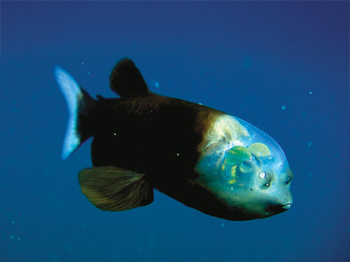 发现地点:美国加利福尼亚州 发现时间:1939年 管眼鱼学名为“大鳍后肛鱼”(macropinna microstoma),最早发现于70年前。图中这条管眼鱼长约15厘米。直到最近,科学家们才发现管眼鱼拥有一个精致、透明、充满液体的圆形头部,好象飞机驾驶座舱一样。由于眼睛呈管状,此前科学家认为这种鱼的视力相对狭隘。但最新研究发现,这种鱼的视力并不受到局限。管眼鱼这种特殊的眼睛结构非常有利于收集光线,适应于太阳光无法射入的漆黑深海环境。它们使用自己超敏感的管状眼睛搜寻模糊轮廓的猎物。科学家曾认为这种眼睛结构是固定向上凝视的,然而这样它们将错过正面迎来的猎物,因为用它们小而尖的嘴很难捕捉到猎物。管眼鱼体长只有几英寸,它的食物来源可能主要是小鱼和水母。它眼睛中的绿色素能过滤射入水面的太阳光,帮助它能够探测到深海中发冷光的水母,或者直接位于其头部以上位置的猎物。当它们发现猎物之后,管眼鱼将向上旋转它们的眼睛,并朝向猎物游去进入猎食状态。